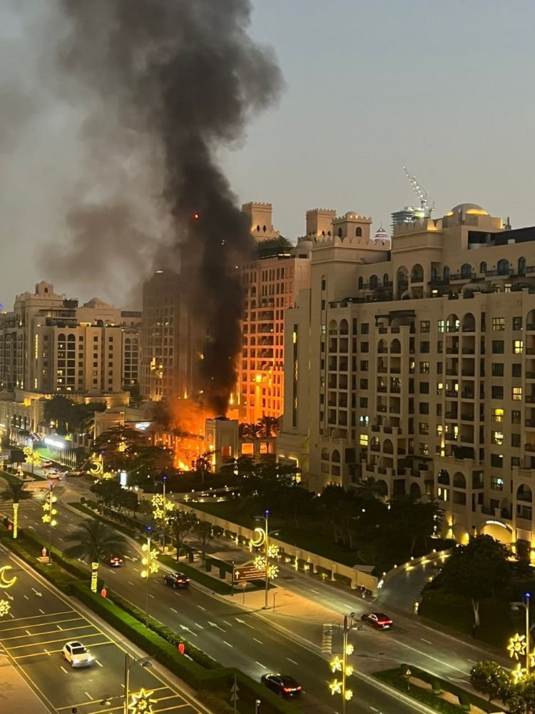 A támadás során tűz ütött ki a Fairmont The Palm luxusszálloda bejáratánál, miután a beszámolók szerint törmelék hullott az égből az épület közelében. A közösségi médiában megjelent, és a sajtó által ellenőrzött felvételeken hatalmas lángok és sűrű füst látható az épület előtt.