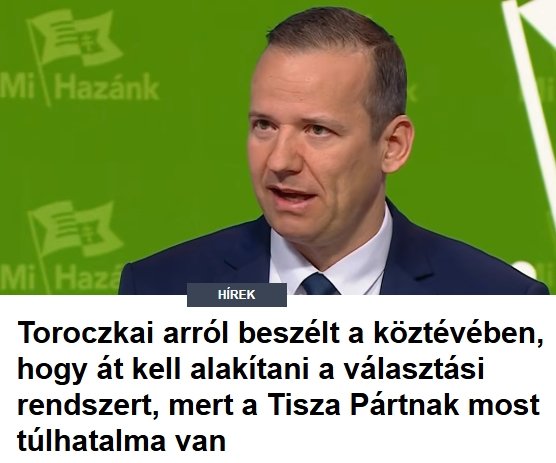 A Mi Hazánk Mozgalom javaslatot fog tenni a választási rendszer átalakítására, mert a jelenlegi túlhatalmat biztosít – jelentette ki Toroczkai László pártelnök az M1 szerda reggeli műsorában. A párt listavezetője szerint a rendszer „teljesen aránytalan”, és ahogy korábban a Fidesznek, most a Tisza Pártnak ad aránytalanul nagy hatalmat. Az interjút 24.hu szemlézte.